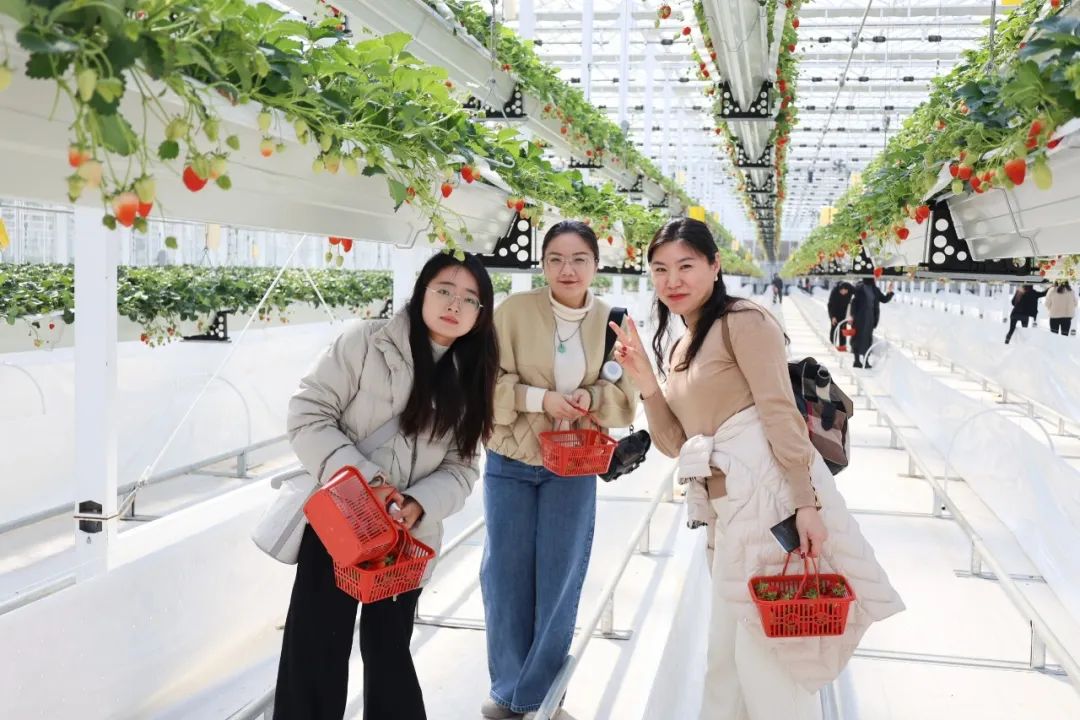 随后,在工作人员的引导下大家进入草莓温室,鲜红欲滴的草莓悬空的绿秧中若隐若现,红绿交映,生机勃勃,清新的草莓果香扑鼻而来。女职工们手提果篮,化身快乐果农,一边采摘品尝,一边相互交流,体验着采摘草莓、品尝鲜果的乐趣,每个人的脸上都洋溢着开心幸福的笑容。